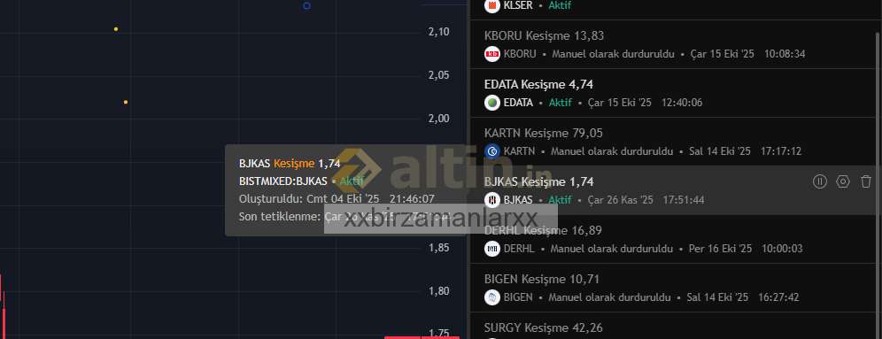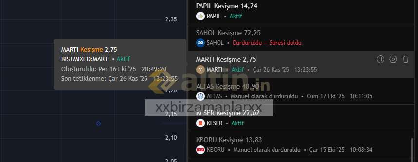 alarmları biraz üstten oluşturuyorum hazırlık için ama hiç bir alarmı zamanında alamadım. hep erken başka hisseler aldım.. terste bırakmadan yukseltmiyor.. formasyonu bitenin en kötü ihtimal hızlıca az yukseltip tekrar düşürüyor formasyonu farklılaştırıyor..((