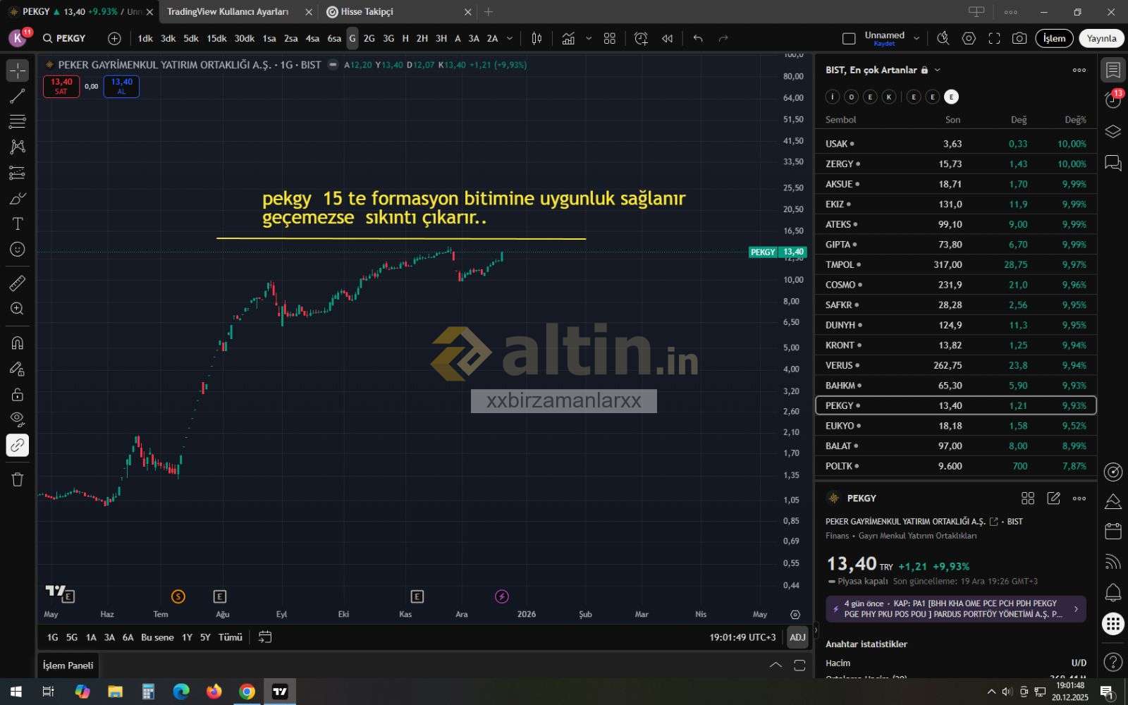 Tavsiye olmamak kaydıyla kendi yaptığımı söyleyeyim. Kanal orta çizgisi olan (tüm zamanların zirvesi olan) 14.16 da kar satışları olacağı beklentisiyle satmıştım. Bugün kanal orta çizgisine tekrar geldi. İlk denemeye göre kanal orta çizgisini kırma ihtimali daha fazla. Ama ben yine güvenli tarafta kalmak için sattım. 14.22 üstünde kapanış görürsem tekrar alabilirim. Bu benim stratejim. Herkesin durumu farklıdır. Yatırım tavsiyesi değildir.