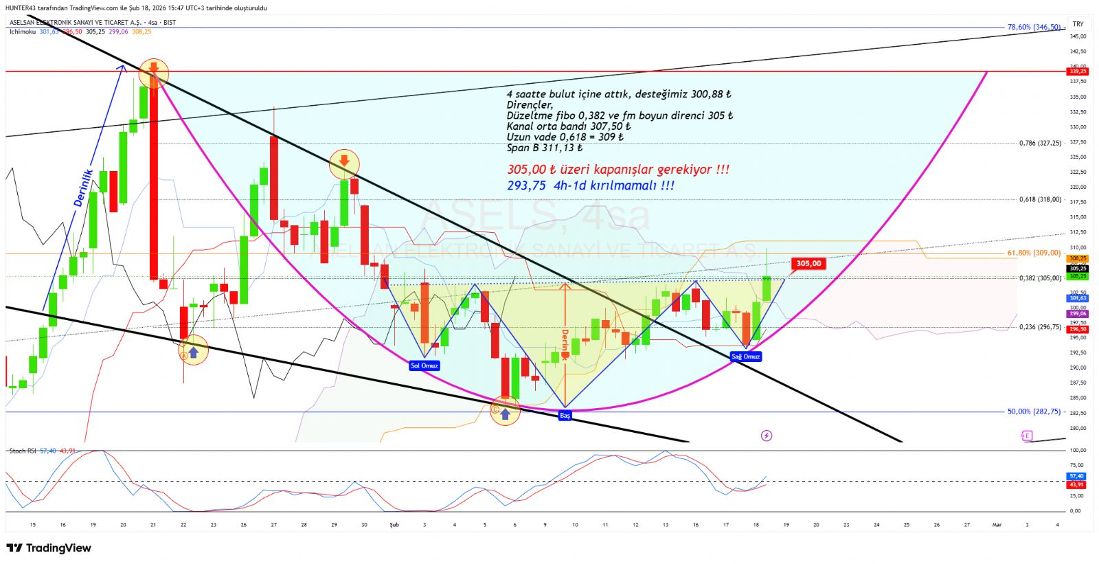 Fm direncini sert kırdık fakat 309- TL 311- TL bölgesi sert direnç olduğu için 310- TL'den satış yedik, tekrar fm boyun bölgesi 305- TL'yi bu kez destek olarak test ettik. 305- ? altında kalmadığımız sürece tekrar 309- TL 311- TL atakları gelecektir.